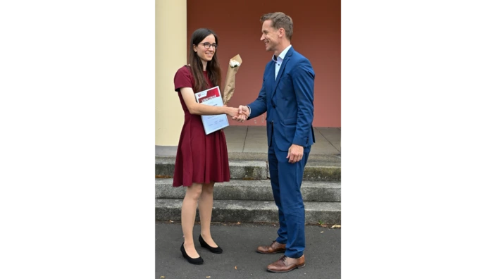 Auch in diesem Jahr stiftete das CJD einen Preis für die besten Abschlussarbeiten. Dabei überreichte Oliver Stier, Sprecher des Vorstands des CJD, den ersten Preis für die beste Bachelor-Arbeit an Ruth Geisler. Ihre mit einem Preisgeld von 1.000 Euro prämierte Arbeit trägt den Titel "Einflussoptionen zur Verhinderung von Machtmissbrauch in religiösen Organisationen am Beispiel der Evangelischen Kirche in Mitteldeutschland" und wurde mit der Bestnote 1,0 bewertet. Oliver Stier hob in seiner Laudatio die Aktualität der Arbeit und der Erkenntnisse hervor.