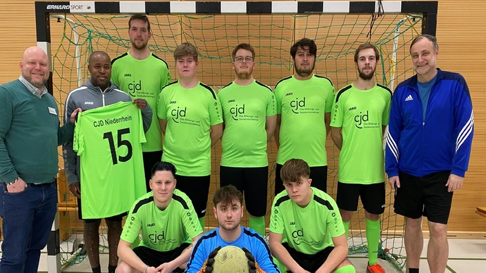 Anfang Februar konnte das Team der Teilnehmenden-Mannschaft ihre neuen Trikots in Empfang nehmen. Nach zwei erfolgreichen Turnier-Siegen hintereinander gab es aus den Händen von Angebotsleiter Bastian Freericks (links im Bild) den neuen Trikotsatz, den die Trainer und Spieler sich selbst ausgesucht hatten.