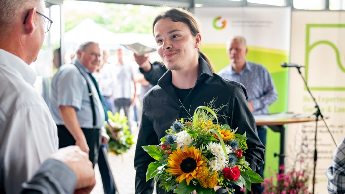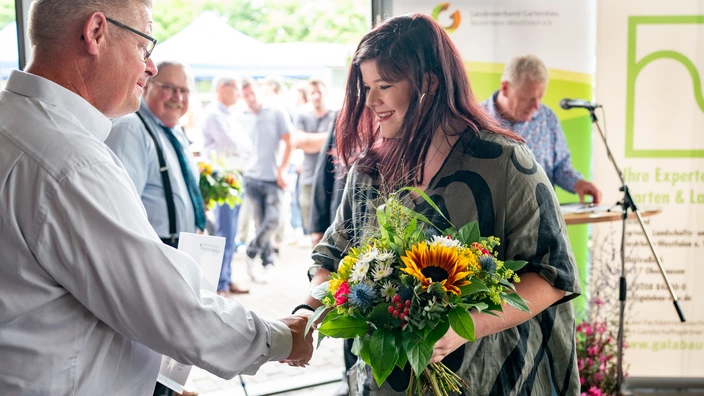 Die Veranstaltung wurde von dem Landesverband Gartenbau NRW und dem Verband Garten-, Landschafts- und Sportplatzbau NRW begleitet. Die entsprechenden Verbandsvertreter*innen Anke Knaup und Frank Linneweber lobten die Leistungen der Absolventinnen und Absolventen. Stefan Brinkmann, Ausbildungsberater der Kammer, moderierte im Anschluss die Zeugnisvergabe. Die Namen und Noten aller Absolventinnen und Absolventen wurden verlesen, so dass alle Prüflinge zusätzlich zu ihren Urkunden auch eine Rose und einen kräftigen Applaus entgegennehmen konnten.