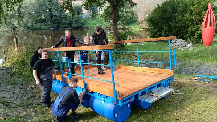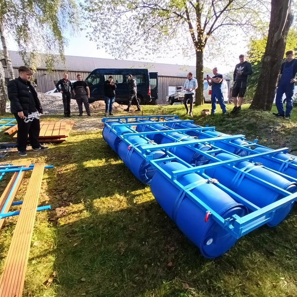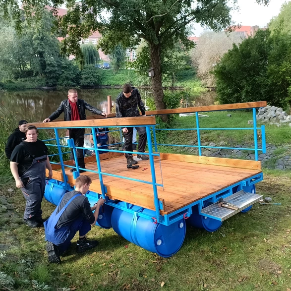 Nach mehr als zwei Jahren Wartezeit wurde ein ehrgeiziges Projekt in der CJD-Einrichtung Bremervörde wiederbelebt: der Bau des Floßes „Lady Huckleberry“. In Zusammenarbeit mit den Auszubildenden der Fachpraktiker-Ausbildung krempelten alle die Ärmel hoch, um das Grundgestell zu restaurieren und das Floß wieder flott zu machen. Stahl und Holz wurden bestellt, die Traglast des Floßes wurde durch Fässer von 1500 kg sichergestellt, und auch Details wie ein Steuerrad, Beleuchtung und Anker fehlten nicht. Über Monate hinweg wurde geschweißt, gepinselt und gehämmert, bis das Floß seetauglich war.
