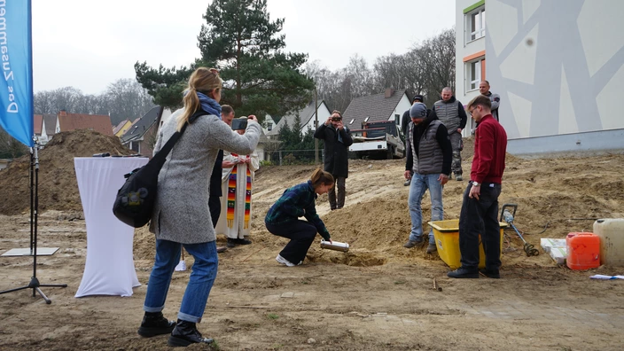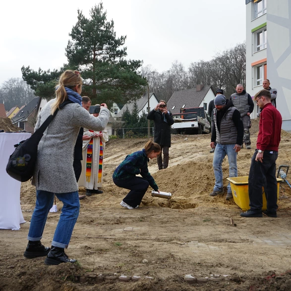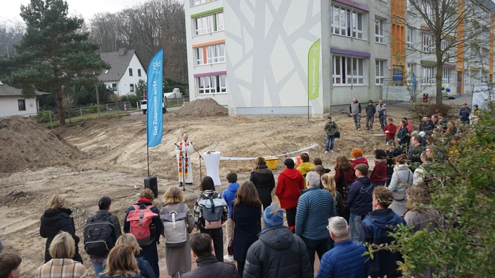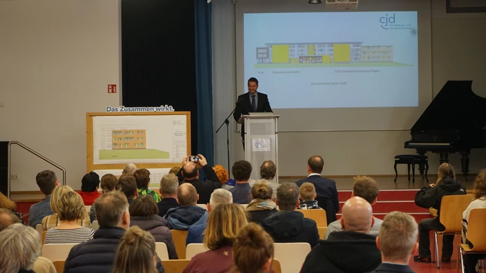 Nach der feierlichen Zeremonie in der Aula begaben sich alle Beteiligten zur Baustelle, wo Pastor Olav Metz von der Evangelischen Kirchengemeinde Mönchgut-Sellin eine besinnliche Ansprache hielt. Anschließend wurde das Band feierlich durchschnitten und eine Zeitkapsel mit Erinnerungsstücken vergraben – ein Symbol für unsere gemeinsamen Visionen und die Zukunft der Schule.