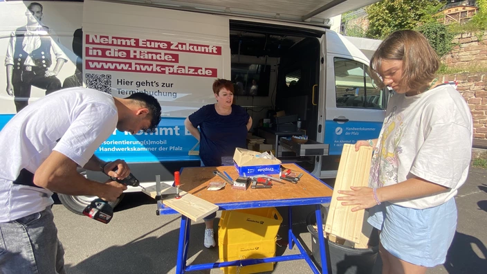 Unter Anleitung von Sabine Theisen und Bernhard Bruchhof von der Handwerkskammer bauten sich die Teilnehmer beispielsweise ein Hängeregal, überprüften anhand von Spiegeln ihre räumliche Vorstellungskraft oder frisierten eine Friseurpuppe. Viele von den Jugendlichen wissen schon genau, als was sie arbeiten möchten. Automechatroniker, Friseurin, Zahnarzt, Erzieherin werden genannt, für einige hat Alexandra Diallo schon einen Praktikumsplatz gefunden, z.B. beim Physiotherapeuten, Zahnarzt oder Friseur, andere nahmen sich die Informationsbroschüre der HWK mit oder bekamen direkte Kontakte genannt.