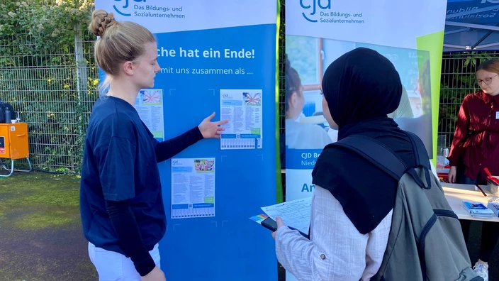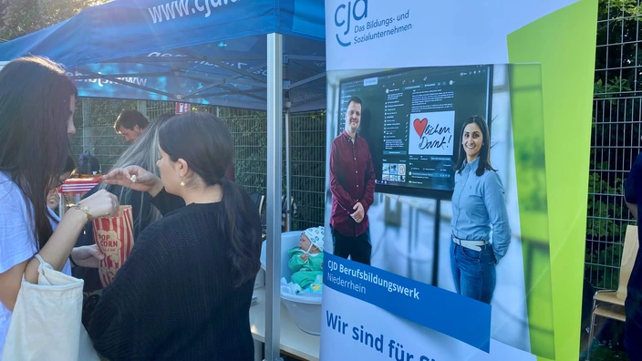 Im Rahmen der Messe stellte sich auch das CJD Berufsbildungswerk Niederrhein und die CJD Pflegeschule aus Wesel vor. Am Stand zwischen den großen blauen CJD Fahnen konnten sich die Jugendlichen über die vielfältigen Angebote im BBW informieren, die Inhalte der Ausbildungen kennenlernen und einen kurzen praxisnahen Einblick in die Tätigkeitsfelder der Pflege bekommen. Während des Inputs durch unsere Teilnehmenden und Ausbilder, konnten sich die Interessenten mit Popcorn und frischem Obst stärken.