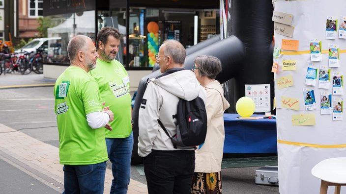 Der Anziehungsmagnet war unsere aufblasbare und riesige Fußball-Dart-Scheibe. Sie stand für Hinschauen, Ausprobieren, Spaß haben und lockte somit viele junge Menschen magisch an. So entstanden in lockerer Atmosphäre schnell Gespräche zum Thema „Zusammen sind wir Zukunft“.
