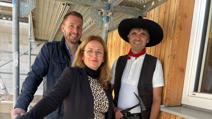 Nach den Ansprachen lud ein Grillbuffet zum gemütlichen Beisammensein ein. Anschließend führte der stellvertretende Schulleiter Robert Wild durch den Rohbau. Bürgermeister Andreas Käske zeigte sich beeindruckt von den Holz-Beton-Verbunddecken und der Handarbeit, die in jedem Bauabschnitt steckt. Architektin Heike Nessler erklärte: „Pro Etage werden rund 15.000 Schrauben verbaut – pro Woche schaffen wir zwei Etagen.“