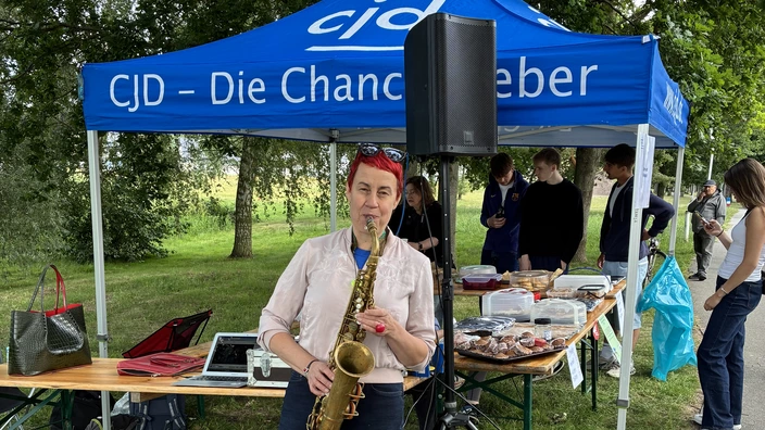 Musikalisch wurde der Lauf von Sandra Weckert am Saxofon begleitet, die so auch gleich den Grundton für den Spendenlauf gab, dessen Einnahmen für die Umsetzung ihres musikalischen Projektes „48 Könige“ an der Schule in Sellin eingesetzt werden sollen.