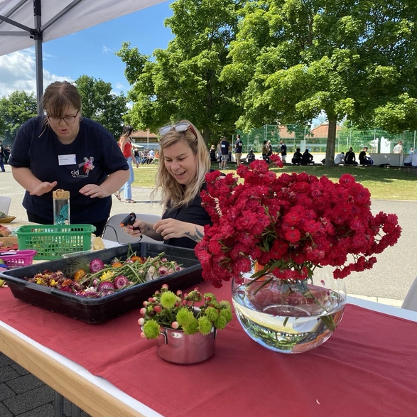 Los ging’s ganz entspannt mit einem gemeinsamen Mittagessen – Auftanken für Körper und Seele, denn danach war Action angesagt. Auf dem Gelände wurde gebastelt, gelacht und gefeiert: Kreativstationen ohne Ende! Buttons gestalten, eigene Shirts designen, Blumen binden wie ein Profi – der Floristikstand war der Place to be für alle mit feinem Händchen.