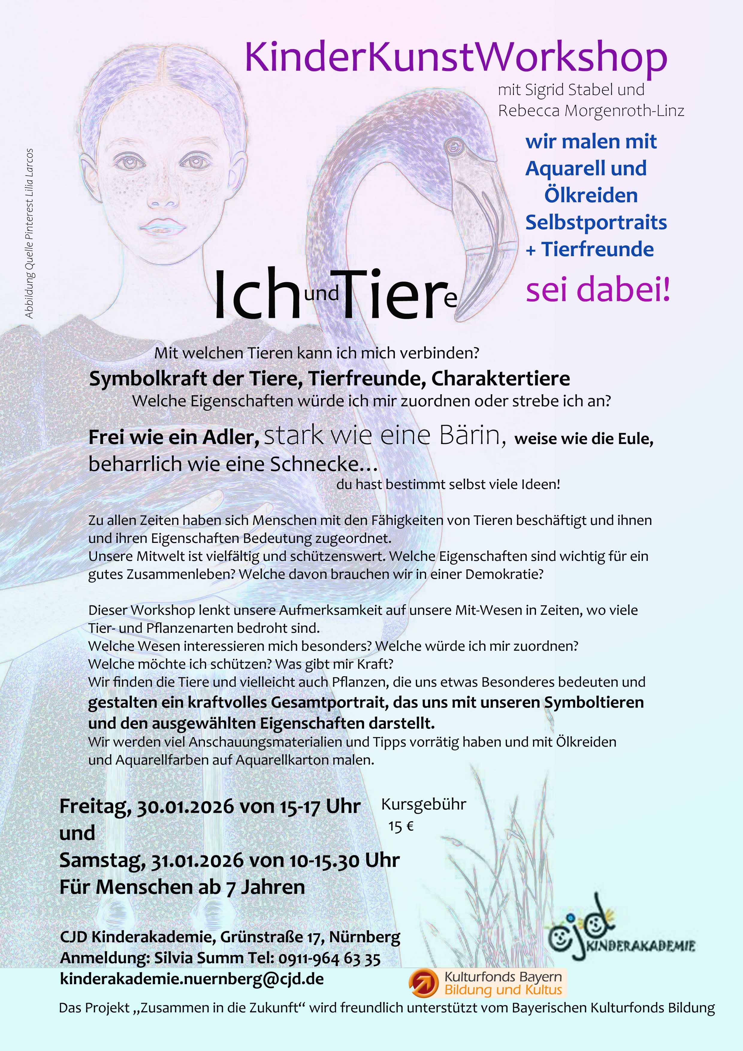 Unser Kunstworkshop "Ich und Tiere" findet am Freitag, 30.1.2026 (15.00 bis 17.00 Uhr) und Samstag 31.1.2026 (10.00 - 15...
