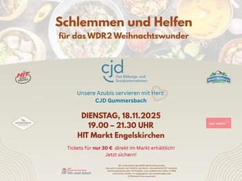 Schlemmen, helfen, Zukunft fördern - gemeinsam fürs WDR2-Weihnachtswunder Am 18. November 2025, 19.00 Uhr findet im HIT Markt Engelskirchen der traditionelle SchlemmerAbend ... Mehr anzeigen