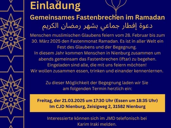Gemeinsames Fastenbrechen im CJD Nienburg Einladung Gemeinsames Fastenbrechen im Ramadan دﻋﻮة إﻓﻄﺎر ﺟﻤﺎﻋﻲ ﺑﺸﻬﺮ رﻣﻀﺎن اﻟﻜﺮﻳﻢ Mehr anzeigen
