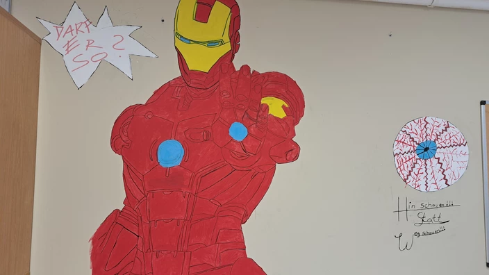 - Wandmalerei "Augen" im Eingangsbereich Haus 5 und Ironman im Unterrichtsraum der Sozialpädagog*innen der Werkstatt Maler/Künstlerisches Gestalten
