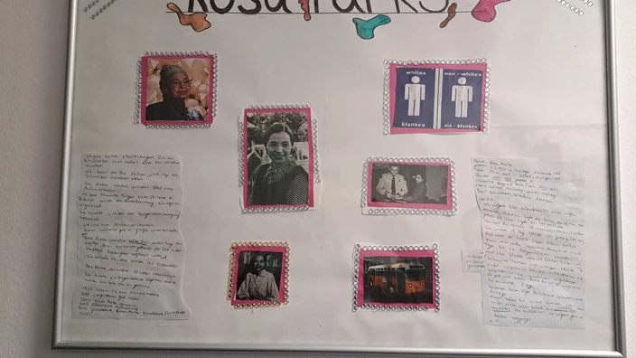 - Kreativ gestaltete Styroporköpfe und Masken, Collagen zum Thema Zivilcourage und Poster berühmte Persönlichkeiten mit Zivilcourage: Rosa Parks in Haus 5 (Friseur/Körperpflege)