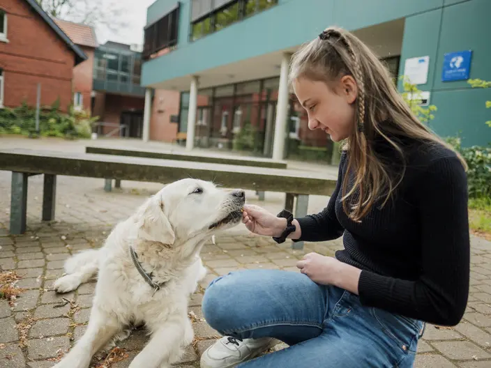 Seit einigen Jahren sorgt er mit seiner beruhigenden Wirkung für eine bessere Lernumgebung. Aber nicht nur das: Zur tiergestützten Pädagogik gehört auch der richtige Umgang mit Tieren und die damit zusammenhängende Verantwortung. All das können die Schüler*innen mit ihm lernen und dabei noch die Kuscheleinheiten genießen.