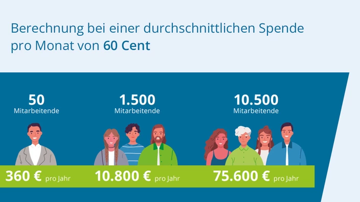 Wenn Sie beispielsweise 60 Cent im Monat spenden, ergibt sich über das Jahr eine Spende von 7,20 Euro. Engagieren sich viele Mitarbeiterenden, vervielfacht sich die Spende.